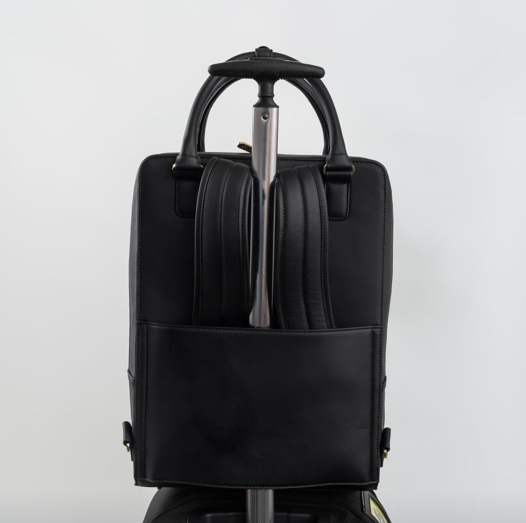 Convert your chic work tote bag into a backpack by utilising the stow away shoulder straps and on the reverse of the bag you will find a luggage strap which converts into a pocket or home for the stow away straps.